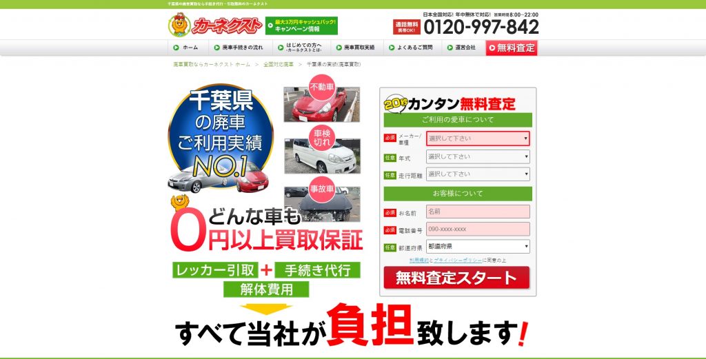 廃車買取おもいでガレージは、千葉県のすぐ隣の東京都葛飾区にある廃車業者ですが、千葉県全域に無料で引取に来てくれます。土日祝日も対応しており、レッカー代、廃車手続無料で、買取価格がサイトに載っていることで評判の業者です。